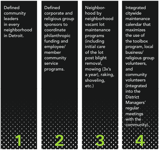 The Mayor should communicate an urgent call to action to all Detroit stakeholders—including businesses, churches and residents—to focus their philanthropic funding and volunteer resource programming on clearing and shared maintenance of vacant lots in the city.