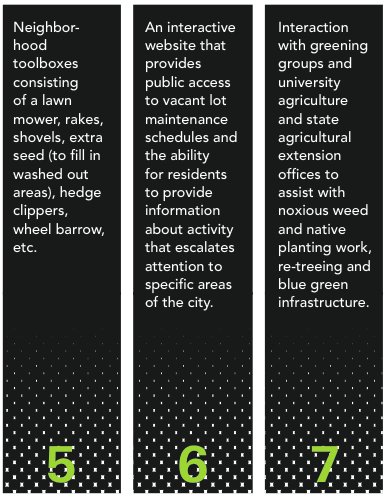 MCR, with the support of the city and strategic partners, should create a framework for a citywide care plan for vacant lots to include: